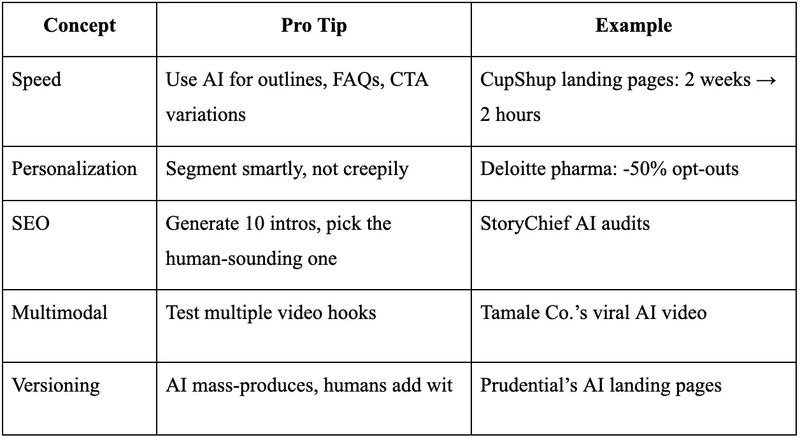 Our own story: landing pages used to take 14 days of back-and-forth. Now it’s a 120-minute sprint. Why? AI does the repetitive work; humans add the brand’s wit.