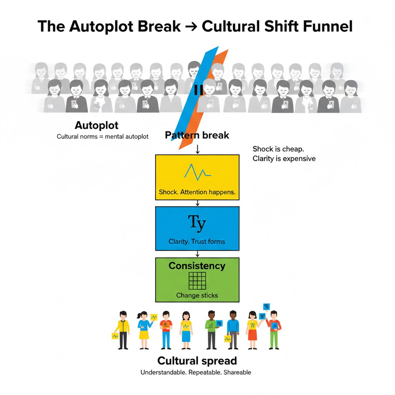 Real cultural change happens when the disruption is understandable, repeatable, and easy for people to pass along without explaining themselves. If someone has to add a paragraph of context before sharing your marketing work, scale becomes impossible.