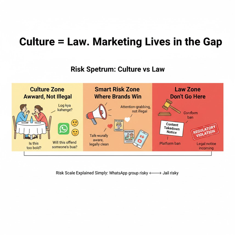 Most ideas that feel “risky” in marketing are not illegal. They are just uncomfortable. Unfamiliar. Thoda sa socially awkward.