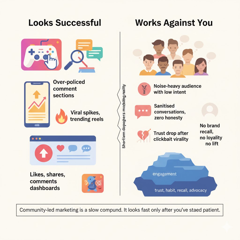 Over-gamification often attracts noise instead of value. Over-moderation kills honesty. Chasing virality on social media can break trust. Measuring only engagement misses long-term marketing impact.