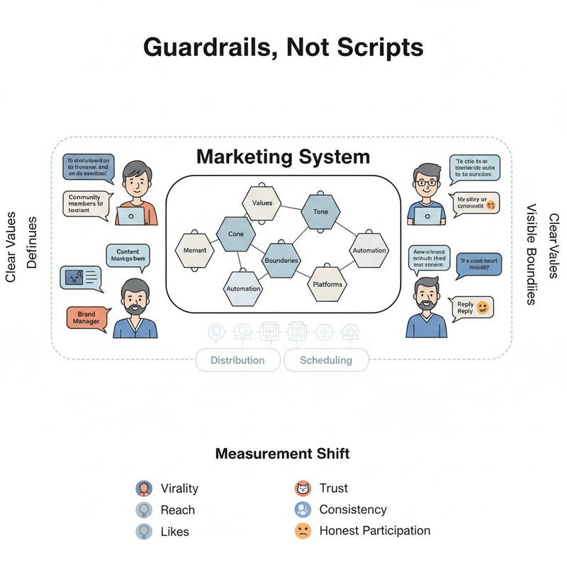 Experienced teams do not script communities. They design guardrails. Values are clear. Tone is defined. Boundaries are visible. Within that space, people feel safe to express, even when marketing automation supports distribution.