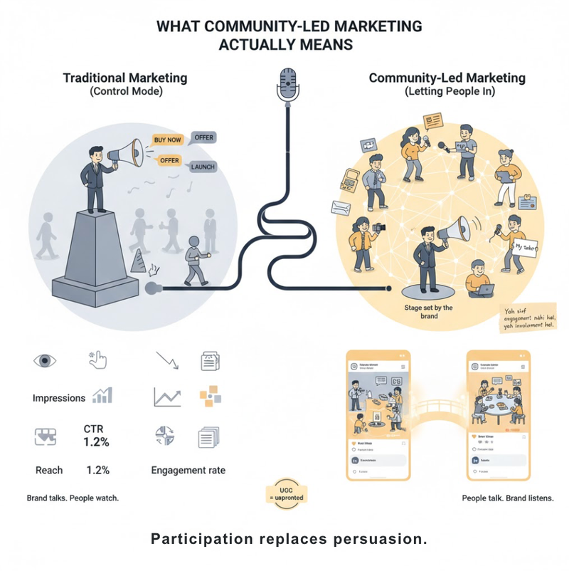 That is where community-led marketing steps in. Not as a trend, not as a tactic, but as a mindset shift in how marketing is designed. From campaigns built for people to ecosystems built with them. From talking at customers to sitting beside them. From “look at us” to “come join us”. From passive views to active participation.