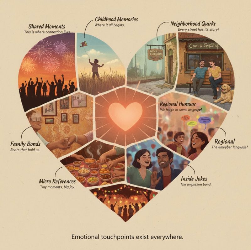 We live in nostalgia. We celebrate every small moment. We speak in stories. Our memories are tied to festivals, flavours, jingles, characters and family rituals. Even daily experiences like chai breaks or WhatsApp jokes are emotional triggers.