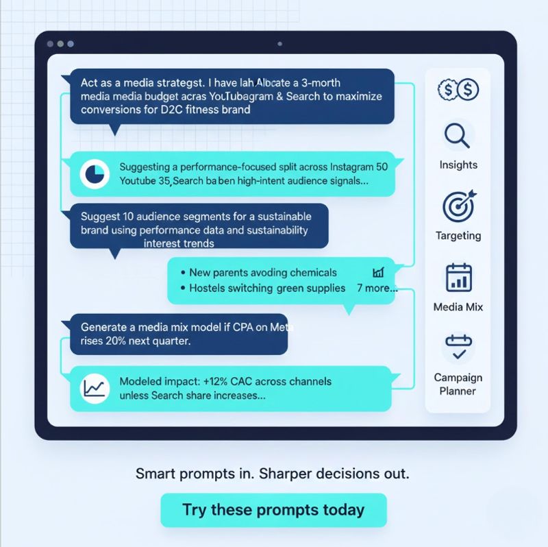 - “Act as a media strategist: I have ₹50 lakh. Allocate a 3-month media budget across YouTube, Instagram & Search in a way that maximizes conversions for a D2C fitness brand".