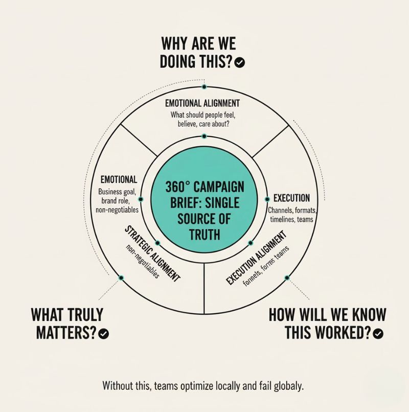 At a very practical level, a 360° campaign brief creates alignment. Emotional alignment. Strategic alignment. Execution alignment.