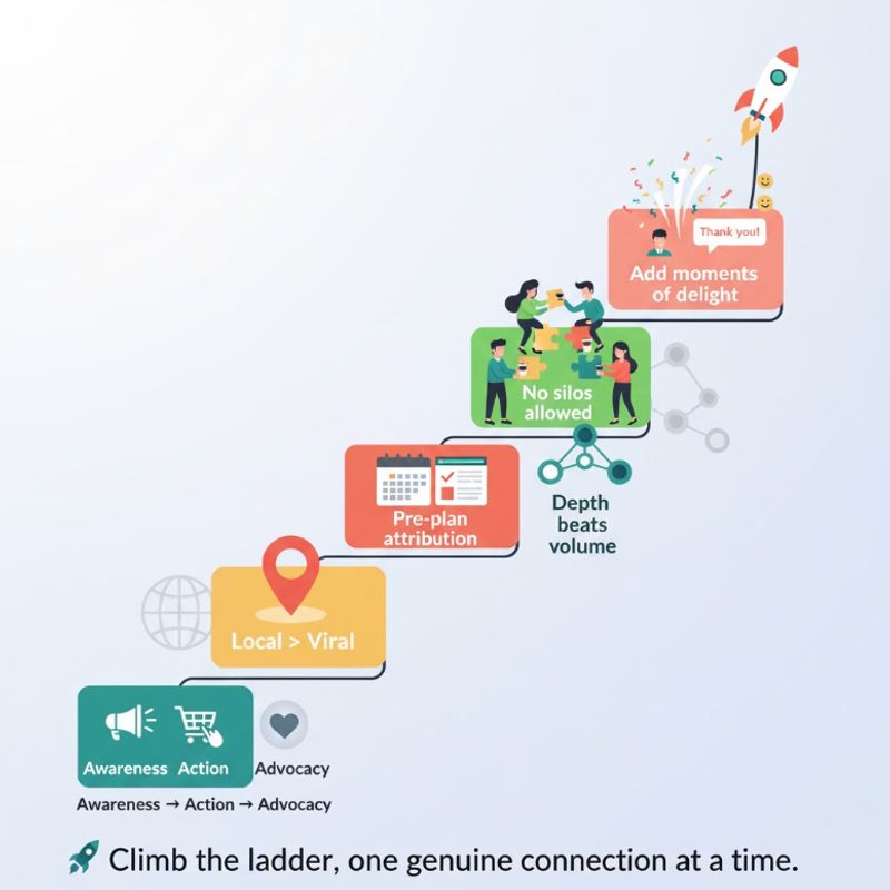 - Build a behavior ladder. Awareness → Action → Advocacy. Every channel should climb that ladder differently.