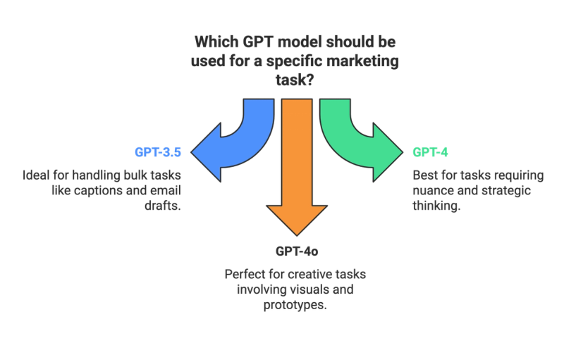 - GPT-3.5 is our workhorse. It handles bulk captions, email drafts, FAQs, quick analysis - the everyday marketing grind.