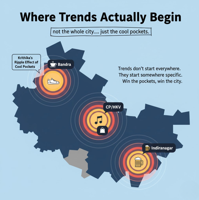 Winning two or three pockets creates a ripple effect. Krithika once called it the ripple effect of cool pockets. Perfect description. If a trend catches in the right neighbourhood, it spreads on its own and your hyperlocal marketing gains instant amplification.
