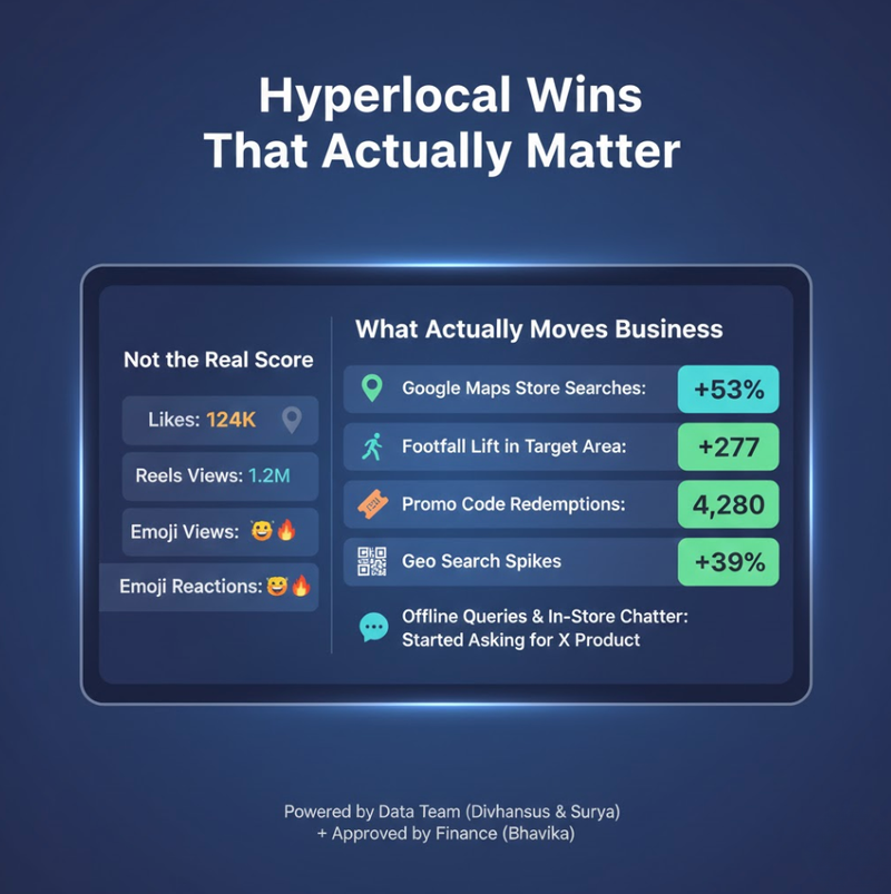 This is where the data team shines. Divyanshu and Surya always remind us to look beyond likes and reels views. Real hyperlocal results show up in data like: