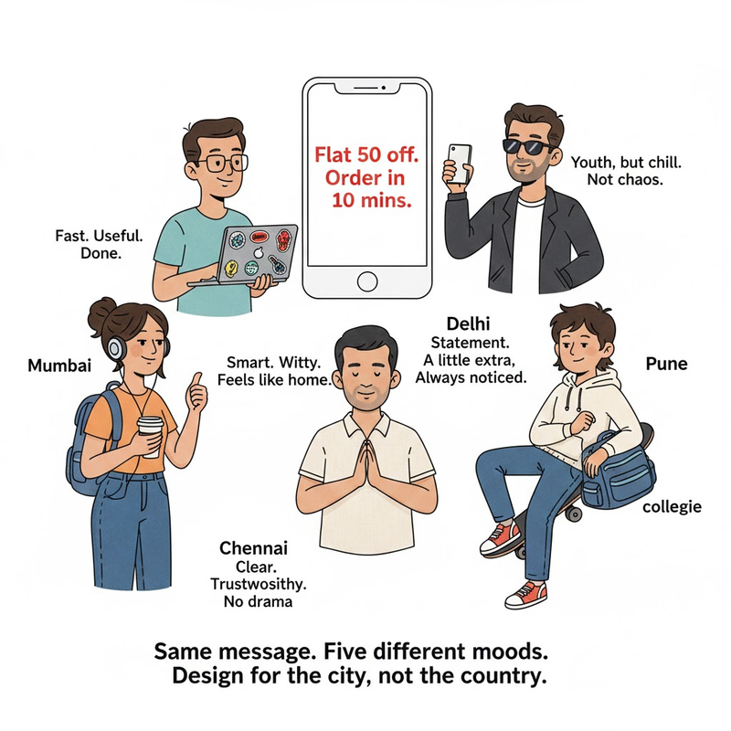 Mumbai likes speed and utility. Bengaluru loves anything smart, witty and community-driven. Delhi likes a bit of aesthetic drama. Chennai prefers clarity and trust. Pune loves youth energy but not chaos.