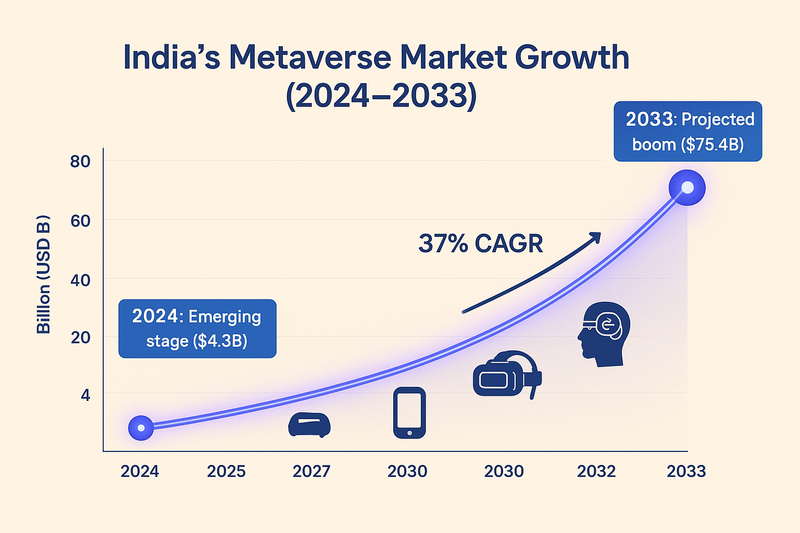 - India’s metaverse market hit 4.3 billion dollars in 2024 and is expected to touch 75.4 billion by 2033 at a 37% CAGR.