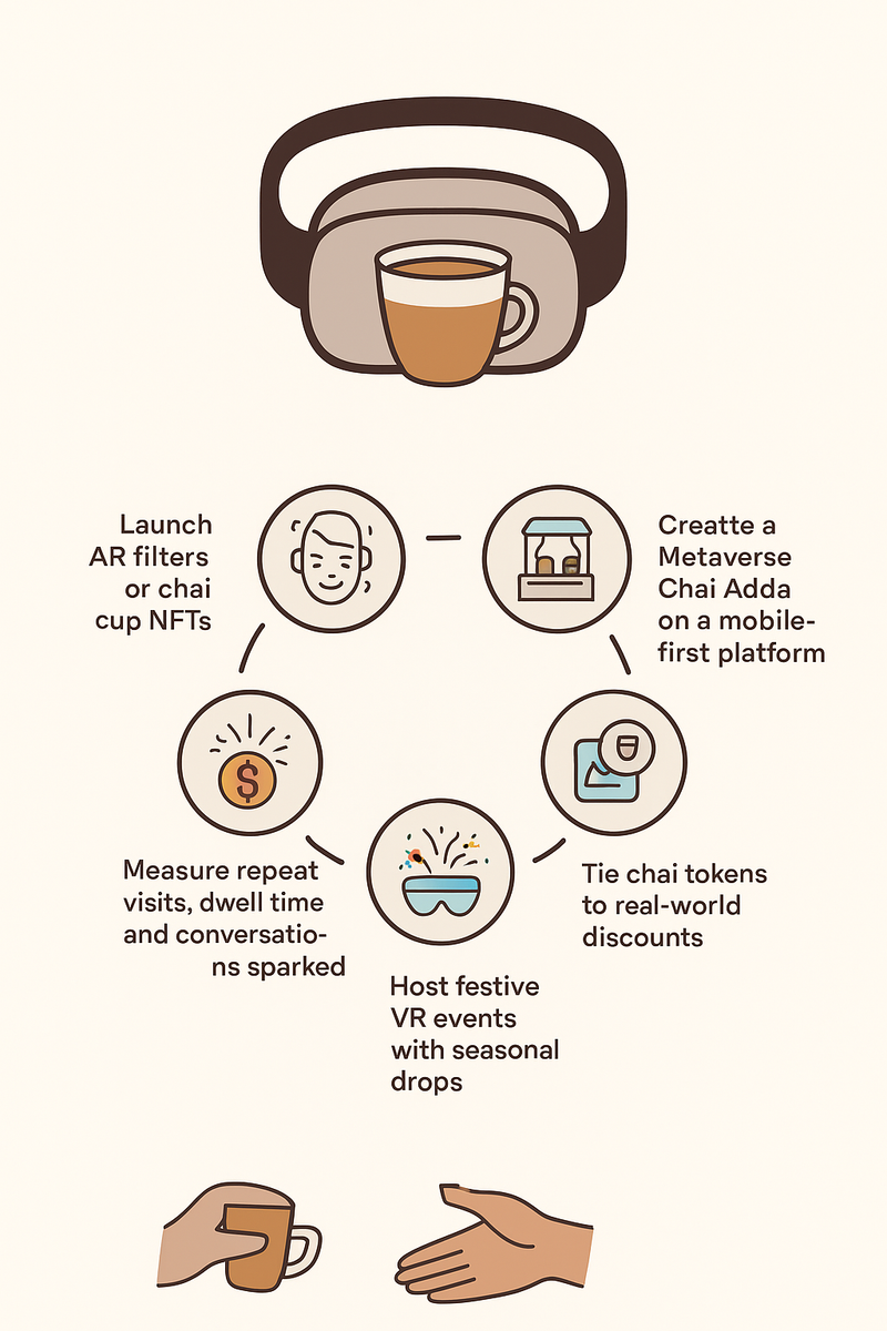 Imagine a Metaverse Chai Adda. Avatars hanging out, sipping virtual kulhads, gossiping about India’s batting order while branded chai tokens unlock real-life discounts. Maaz once joked, “What if you could order kadak chai for your avatar and get Swiggy to deliver it to your desk IRL? That’s meta delivery”. Crazy, but not impossible.