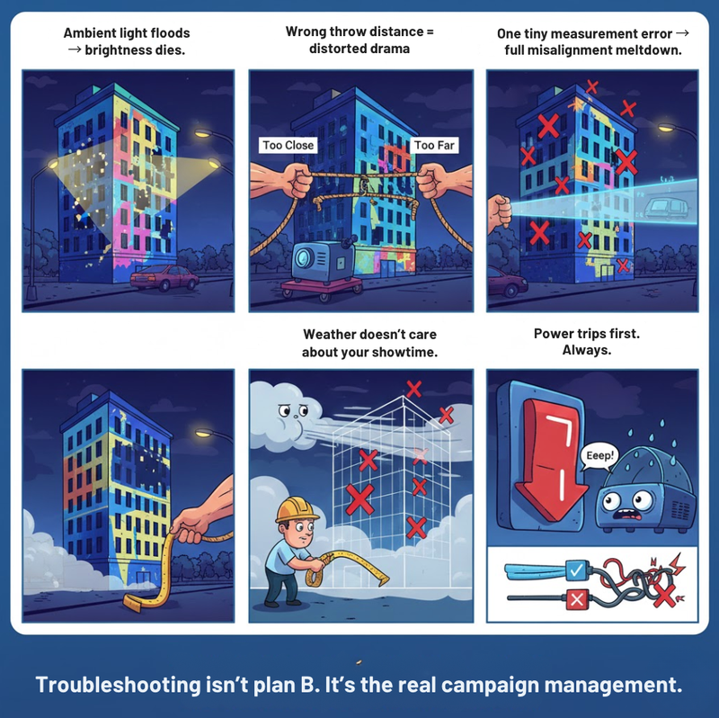 To get this right you need projectors with huge brightness, sometimes 20,000 to 50,000 lumens each depending on the surface. These aren’t home cinema projectors. These are heavy-duty, back-breaking beasts that need strong rigging, clean power and stable placement.