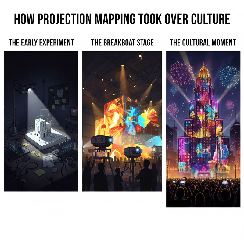 Projection mapping started as a futuristic idea in theme parks. As hardware improved and creatives got bolder, projection mapping stepped out of controlled rooms and onto entire cityscapes.