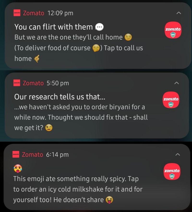 Zomato’s notifications do this cleverly too. They feel personal and funny. Even people who do not order end up sharing screenshots because they want to show off how relatable or creative the line was. That is branding disguised as everyday marketing.