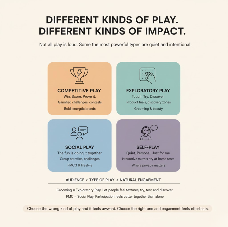 The key is matching the type of play to the audience and the category. Grooming brands, for example, benefit hugely from exploratory play. Let people try, test, and discover at their own pace. FMCG brands often thrive on social play, where participation becomes a group activity rather than an individual one.