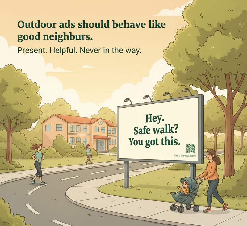 Outdoor ads should feel like polite guests. They should not shout. They should not guilt people. They should not try to hijack someone’s peaceful moment. They should stay in the background unless invited into the viewer’s mind.