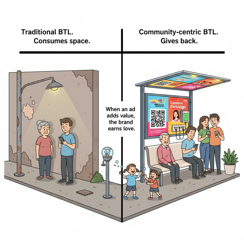 Some outdoor ads genuinely improve public space. A bit of shade, a bench, a light that makes a dark corner safer, an interactive element that brings joy. When an ad gives something back, the community remembers it far more fondly.