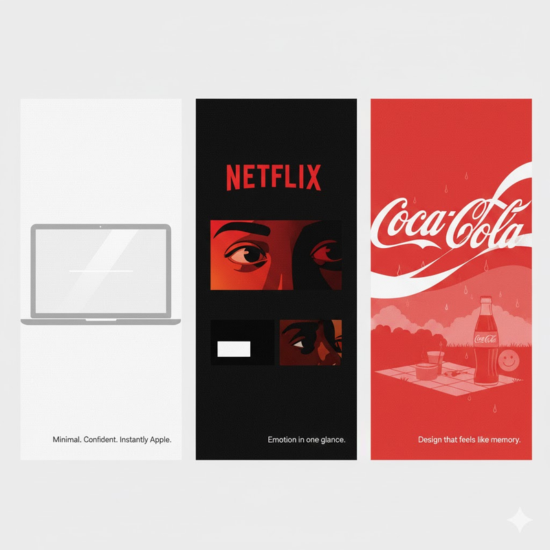 Some of the best brands in the world have mastered this. Think Apple , minimal, confident, no wasted space. You could remove the logo, and you’d still know it’s them. Netflix? Every thumbnail is engineered to make you feel something in one glance , tension, humor, heartbreak. And Coca-Cola, with its red-white balance and curved typography, has turned design into nostalgia.