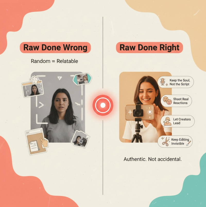 Now, before everyone rushes to film their next campaign on a shaky phone, let’s clarify something , raw doesn’t mean random. There’s a difference between authenticity and apathy.